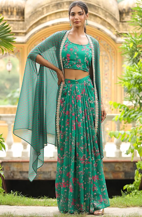 Elevate your style with this stunning ensemble from Soura. Crafted from luxurious green georgette, this set features a beautifully pleated skirt adorned with intricate floral prints. The matching crop top boasts a round neckline and delicate detailing, while the elegant cape adds a touch of sophistication. Perfect for special occasions or everyday wear, this set is a must-have for any fashion-forward woman.