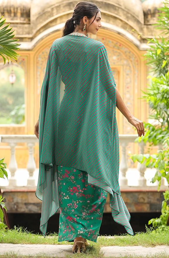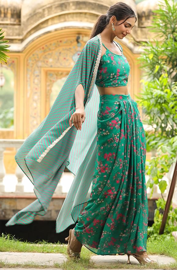Soura’s Green Georgette Floral Printed Pleated Skirt with Top & Cape Set