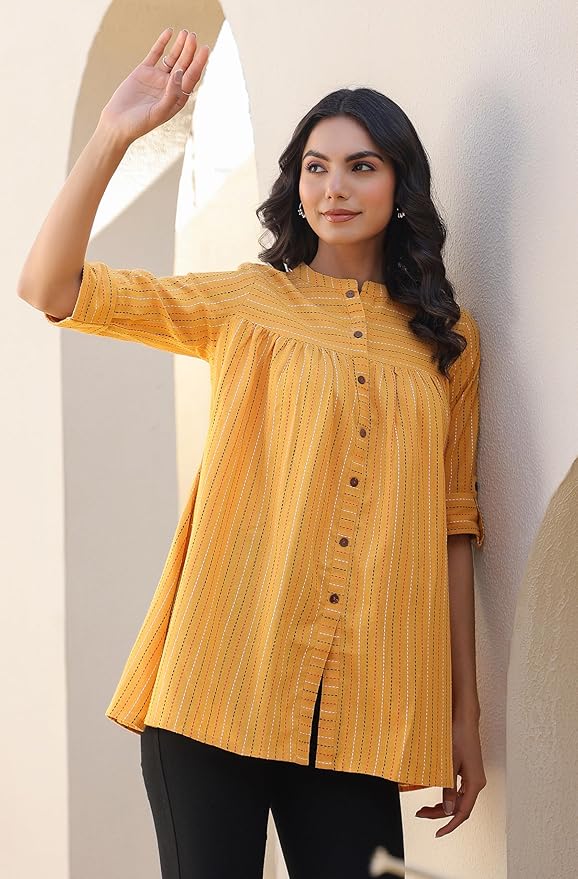 - Style: Length: 30(inch) | Pattern: Woven Design | Occasion: Casual | Type: Gathered| Sleeve Type: Half Sleeve (Half Sleeve) | Color: Mustard