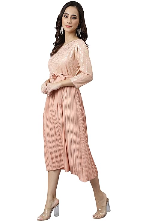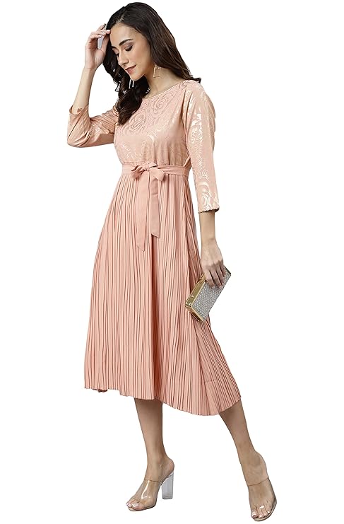 • Style: Length: 45(inch) | Pattern: Botanical Printed | Occasion: Casual | Type: Flared | Sleeve Type: 3/4 Sleeves Regular Sleeves | Color: Peach