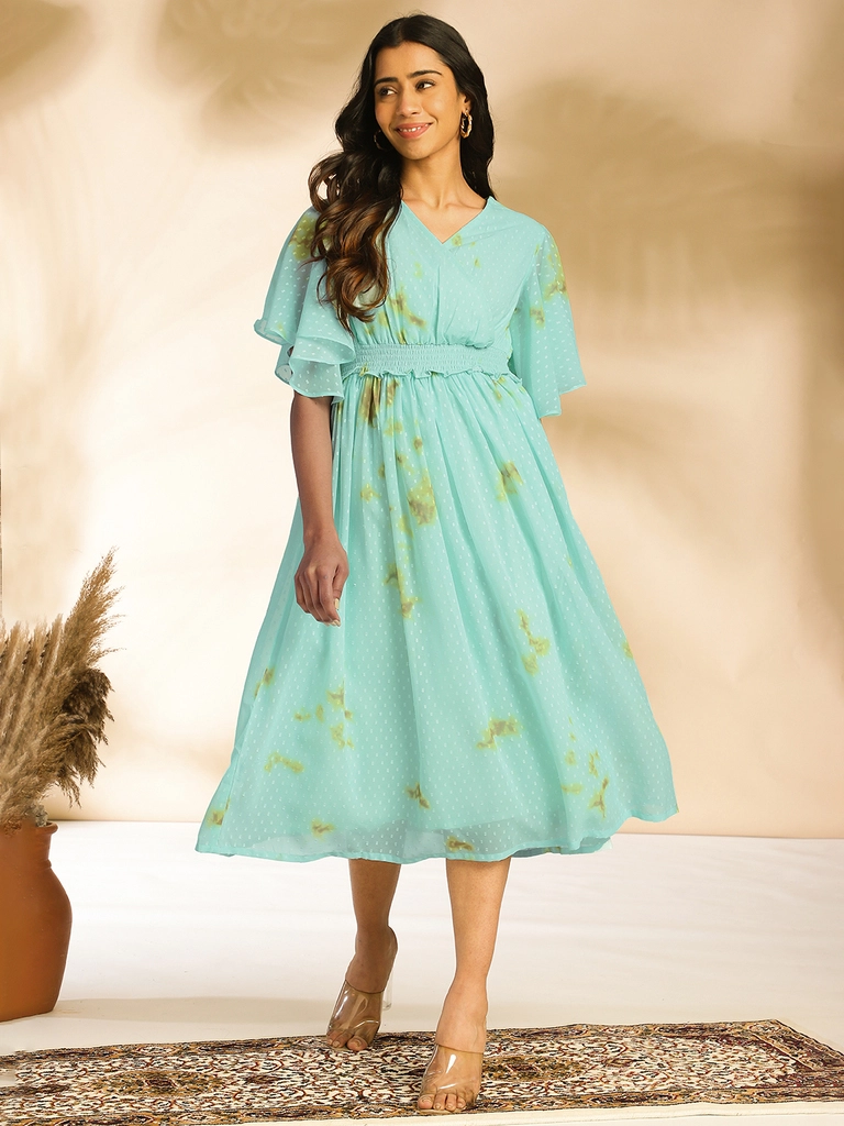 Sea Green Dobby Georgette Tie-Dye Fit & Flare Dress