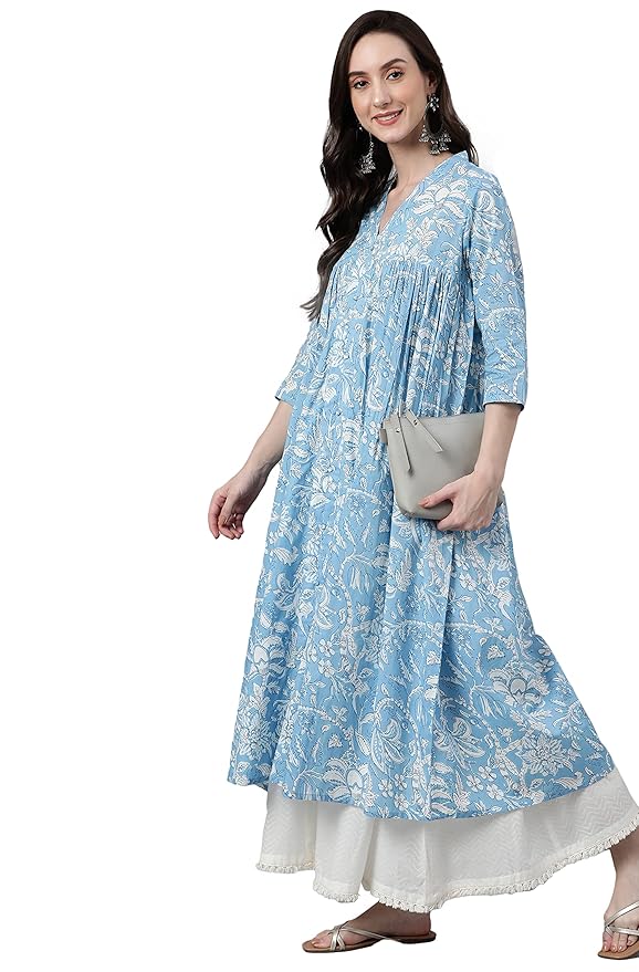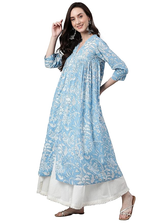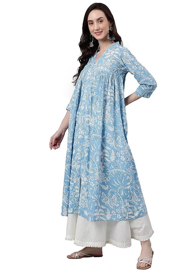 • Style: Length: 45(inch) | Pattern: Floral Printed | Occasion: Casual | Type: Flared | Sleeve Type: 3/4 Sleeves Regular Sleeves | Color: Sky Blue