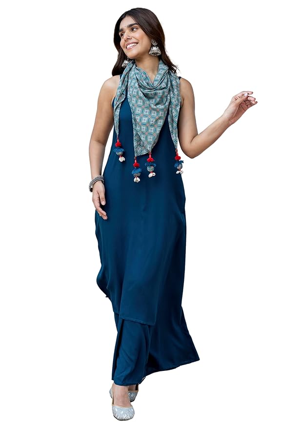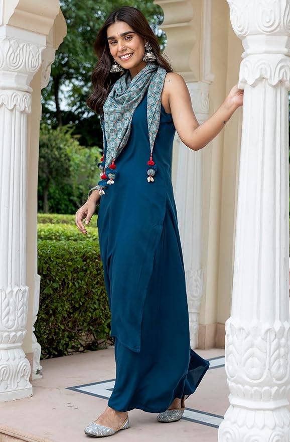 Teal Blue Rayon Solid Kurta with Palazzo and Scarf