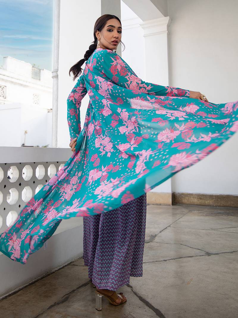 Turquoise Georgette Chevron 3 Piece Jacket Set