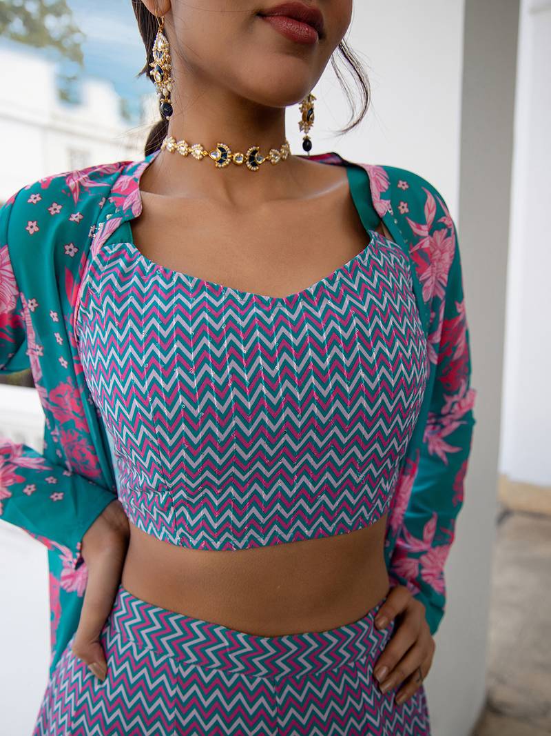 - [Unique Design] Regular Style with jacket and straps crop top, Unique Chevron style, Turquoise Trending hue, Festive-Wedding Style, woven georgette fabric, layered, Intricate details with sequin embroidery and floral pattern, crop top with Pant and Jacket set. Make it an Ideal Clothing Choice for any wedding occasion.